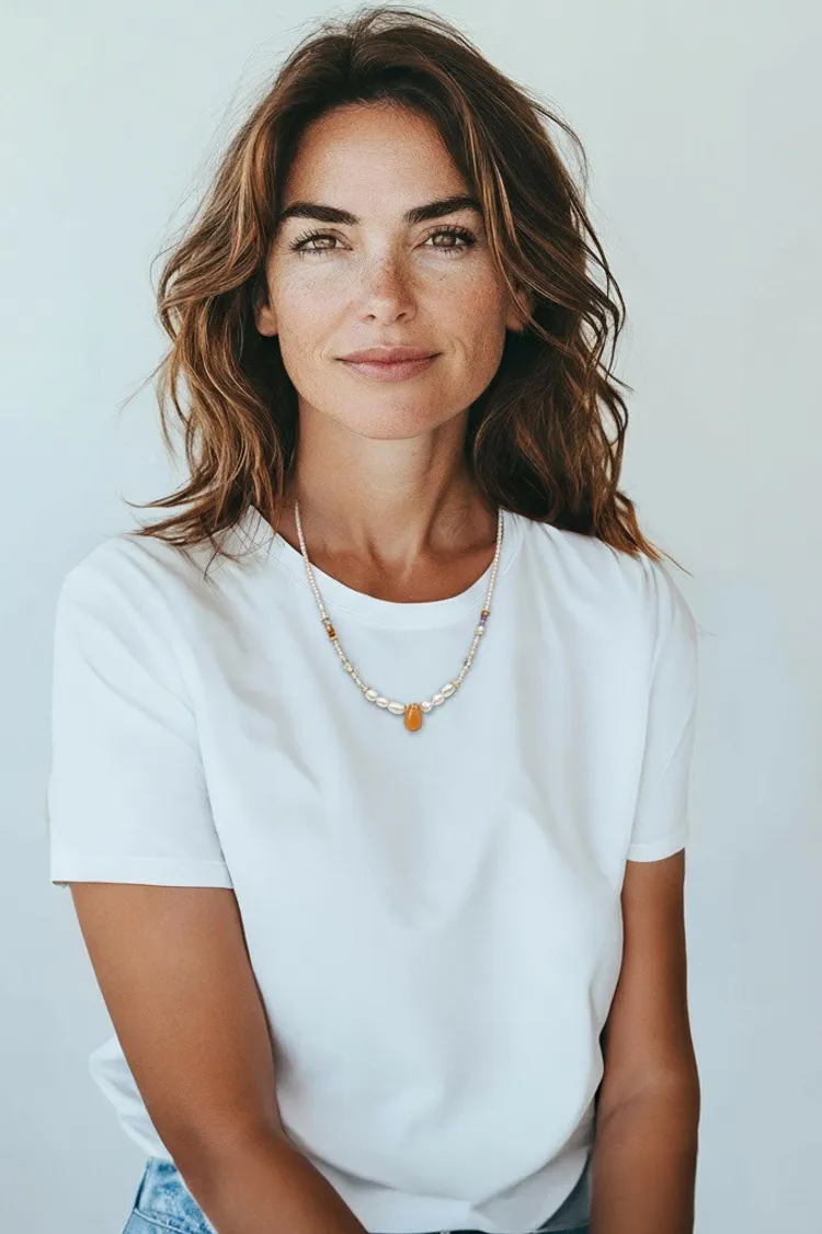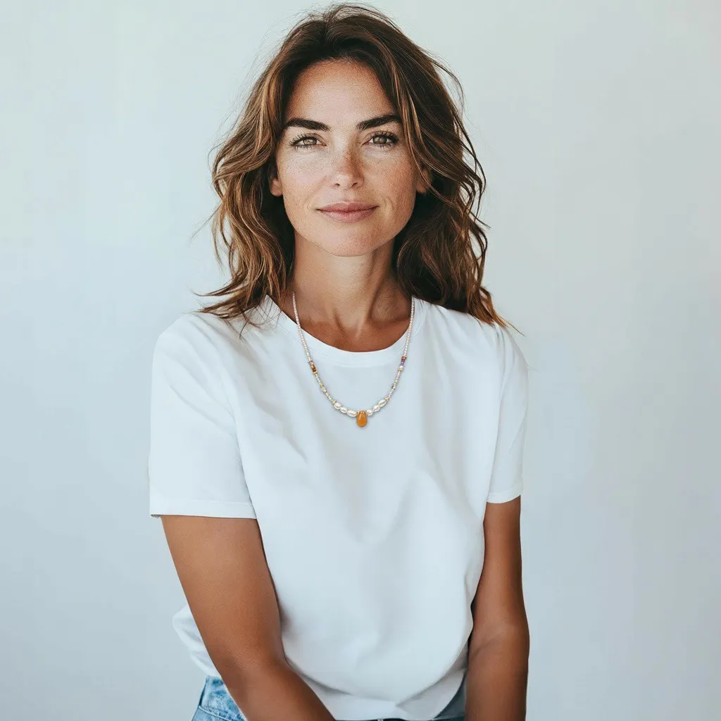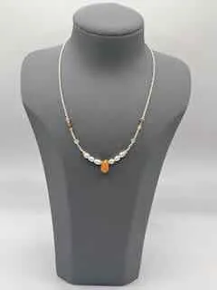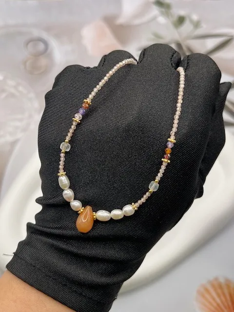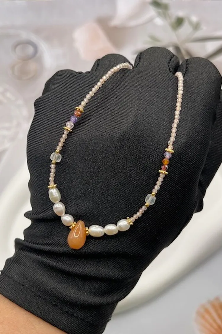 珍珠常給人一種老氣或是很成熟的刻板印象,但這款項鍊除了珍珠,還搭配了些琉璃珠,和金色的飾品;